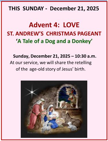 St. Andrew's is an inclusive and affirming Christian community of faith worshiping God and serving others. Inspired by Holy Scripture and guided by tradition, reason, and experience, we share the ministry of Jesus Christ by nurturing spiritual growth, caring for creation, and being with those in need.